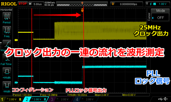 クロック信号が出力するまでの一連の流れを波形測定しています。