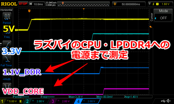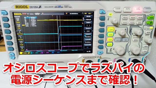 実際にオシロスコープでラズパイの電源シーケンスの測定まで実施しました。