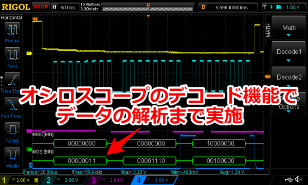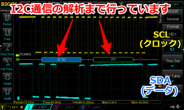 オシロスコープのデコード機能を使うことで、データの中身まで解析可能です。