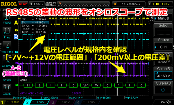 電圧レベルが「-7V~+12Vの範囲」「200mV以上の差動振幅」で規格内を確認しています。