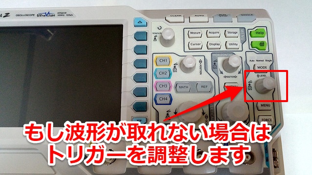 もし「RUN」を押しても波形が取れない場合はトリガーを調整してみます。