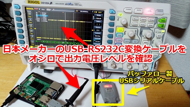 USB-RS232C変換ケーブルをオシロで出力電圧レベルを確認できます。