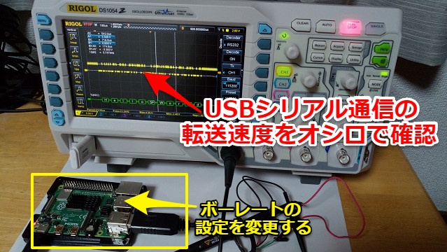 USBシリアル通信のボーレート設定を変更して、実際の転送速度をオシロで確認しました。