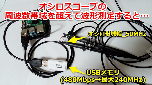 オシロの周波数帯域が50MHzに対して、約4倍のUSB2.0(最大240MHz)で確認しました。