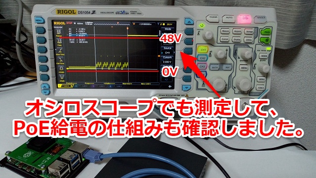 オシロスコープでDC48Vを測定して、PoE給電の仕組みも確認しました。