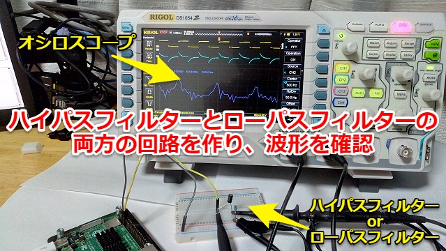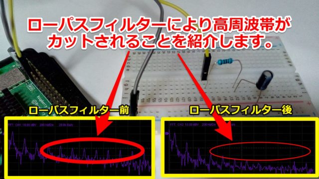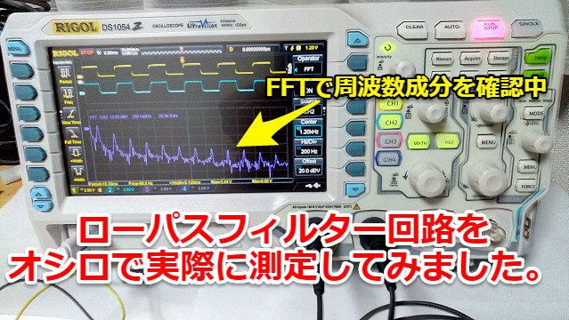 ローパスフィルターの効果をオシロスコープで確認しています。(リンク先はこちら)
