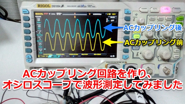 ACカップリングの回路を作り、オシロスコープで波形測定してみました。