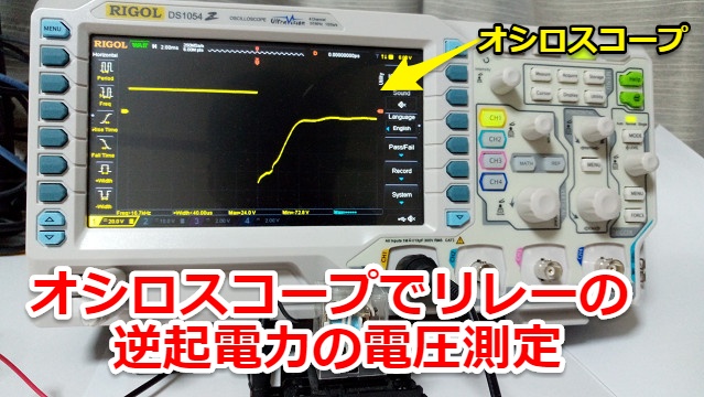 実際にオシロスコープでリレーの逆起電力の電圧波形まで確認しています。