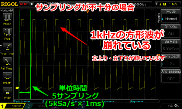 サンプリングレートが十分でないと正確な波形が測定できません。