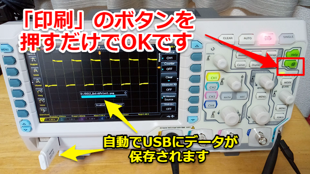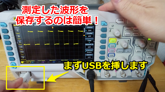 測定した波形を保存する方法は簡単です。まずUSBを挿します。