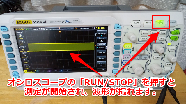 オシロスコープの「RUN/STOP」を押すと測定が開始されます。