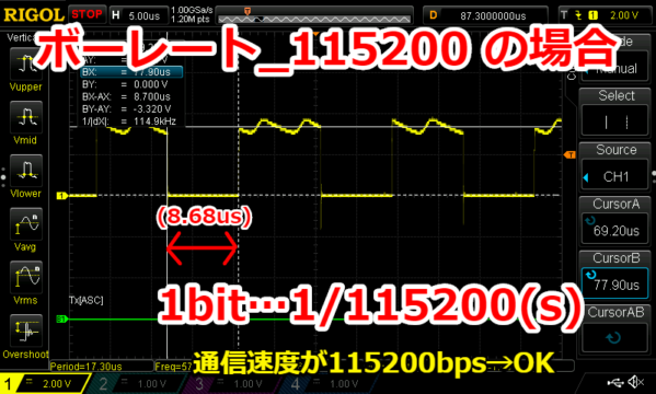 1bit辺りの転送時間は1/115200s(8.68us)となり、通信速度が115200bpsを確認できました