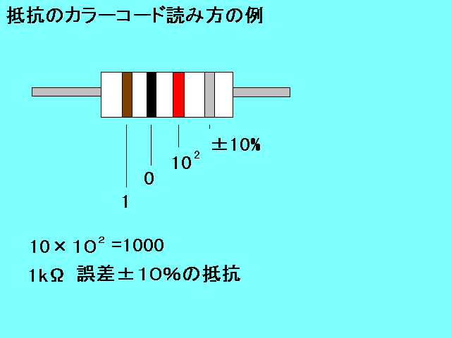 抵抗のカラーコードは左の二つが数値を表し左から3つめが乗数を表します。一番右側が許容差を表しています。